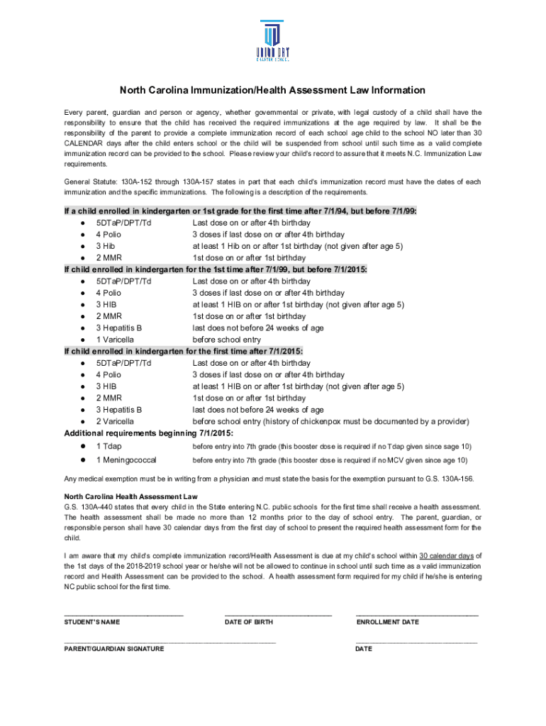 North Carolina Immunization/Health Assessment Law Information Every parent, guardian and person or agency, whether governmental or private, with legal custody of a child shall have the responsibility