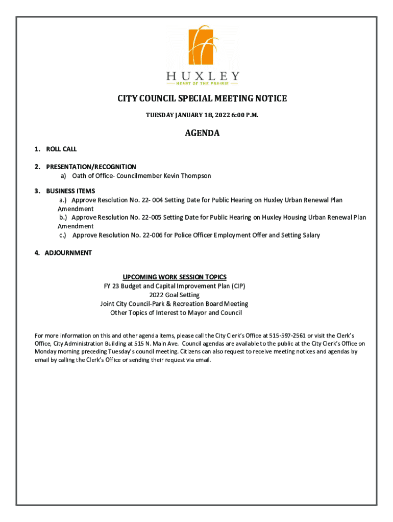 CITY COUNCIL SPECIAL MEETING NOTICE TUESDAY, JANUARY 18, 2022 6:00 P.M.AGENDA 1. ROLL CALL 2. PRESENTATION/RECOGNITION a) Oath of Office Council member Kevin Thompson 3. BUSINESS ITEMS a.) Approve