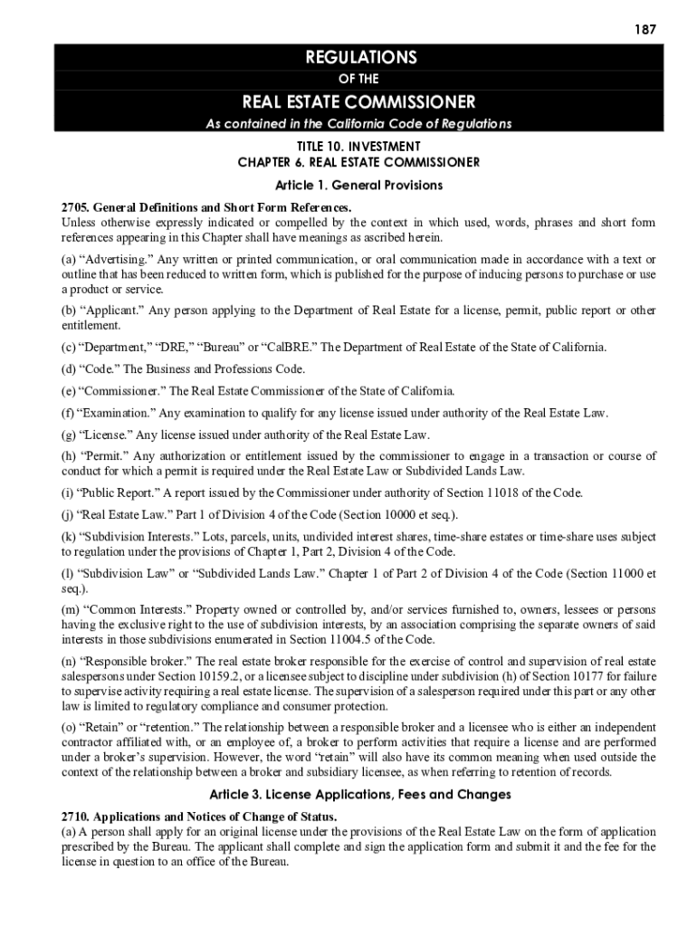 187REGULATIONS OF THEREAL ESTATE COMMISSIONER As contained in the California Code of Regulations TITLE 10. INVESTMENT CHAPTER 6. REAL ESTATE COMMISSIONER Article 1. General Provisions 2705. General
