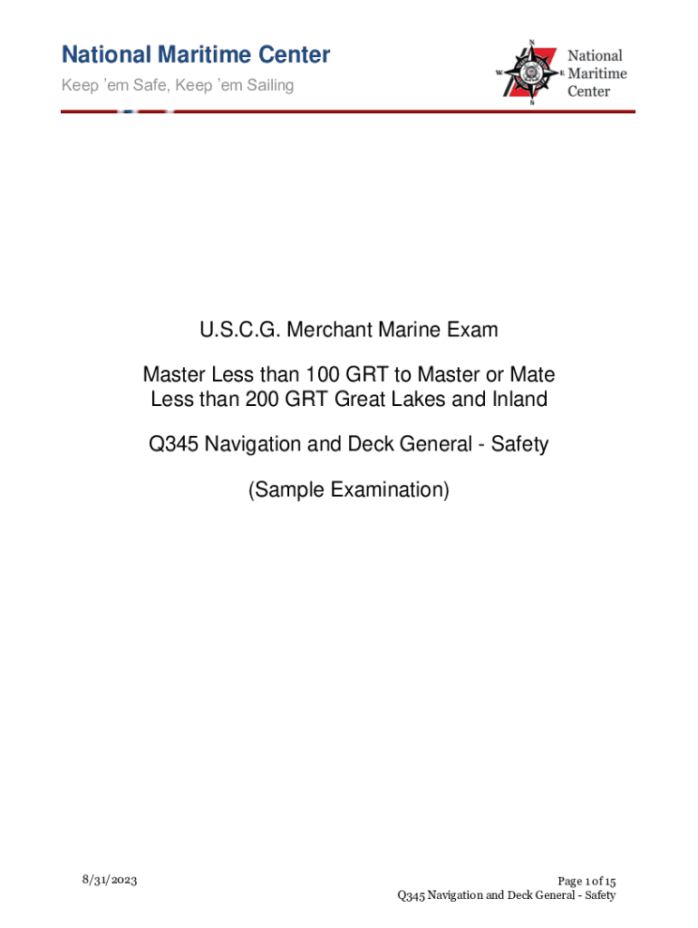 National Maritime Center Keep em Safe, Keep em Sailing. S.C.G. Merchant Marine Exam Master Less than 100 GET to Master or Mate Less than 200 GET Great Lakes and Inland Q345 Navigation and Deck General