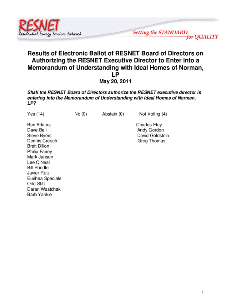 Get the free Results of Electronic Ballot of RESNET Board on Ideal Homes MOU