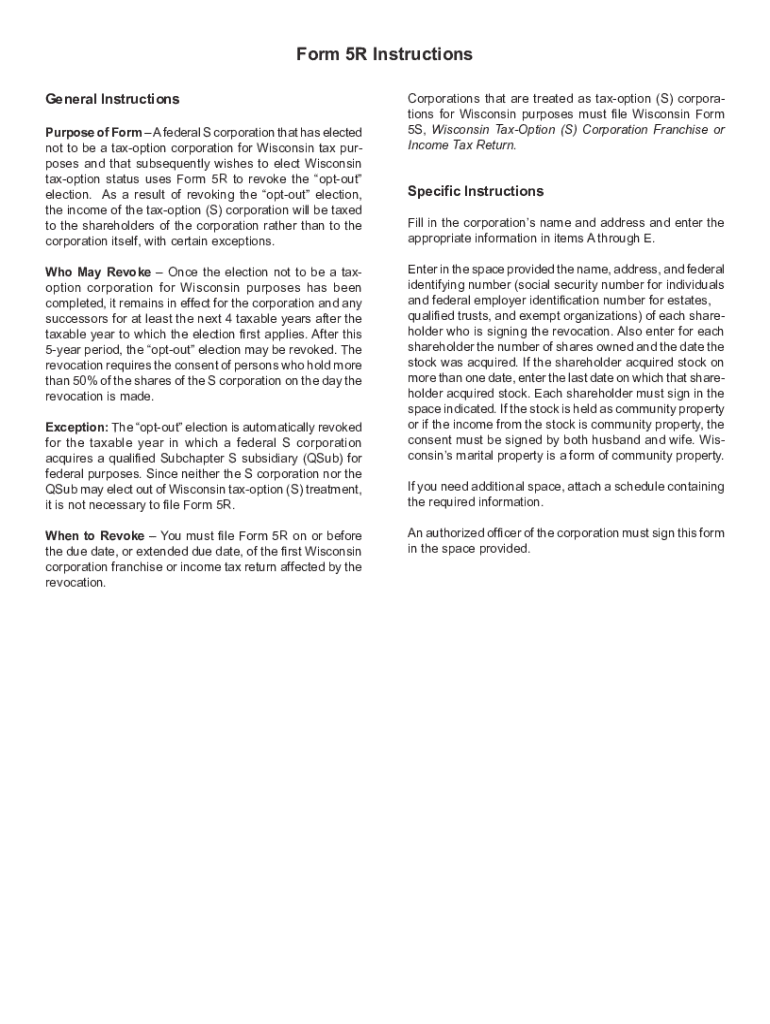 Form 5R Instructions General Instructions Purpose of Form A federal S corporation that has elected not to be a taxoption corporation for Wisconsin tax purposes and that subsequently wishes to elect