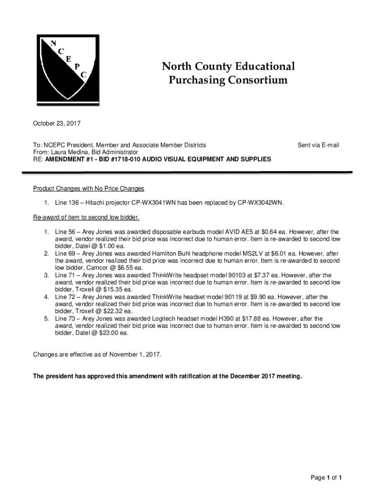 North County Educational Purchasing ConsortiumOctober 23, 2017To: NCEPC President, Member and Associate Member Districts From: Laura Medina, Bid Administrator RE: AMENDMENT #1 BID #1718010 AUDIO VISUAL