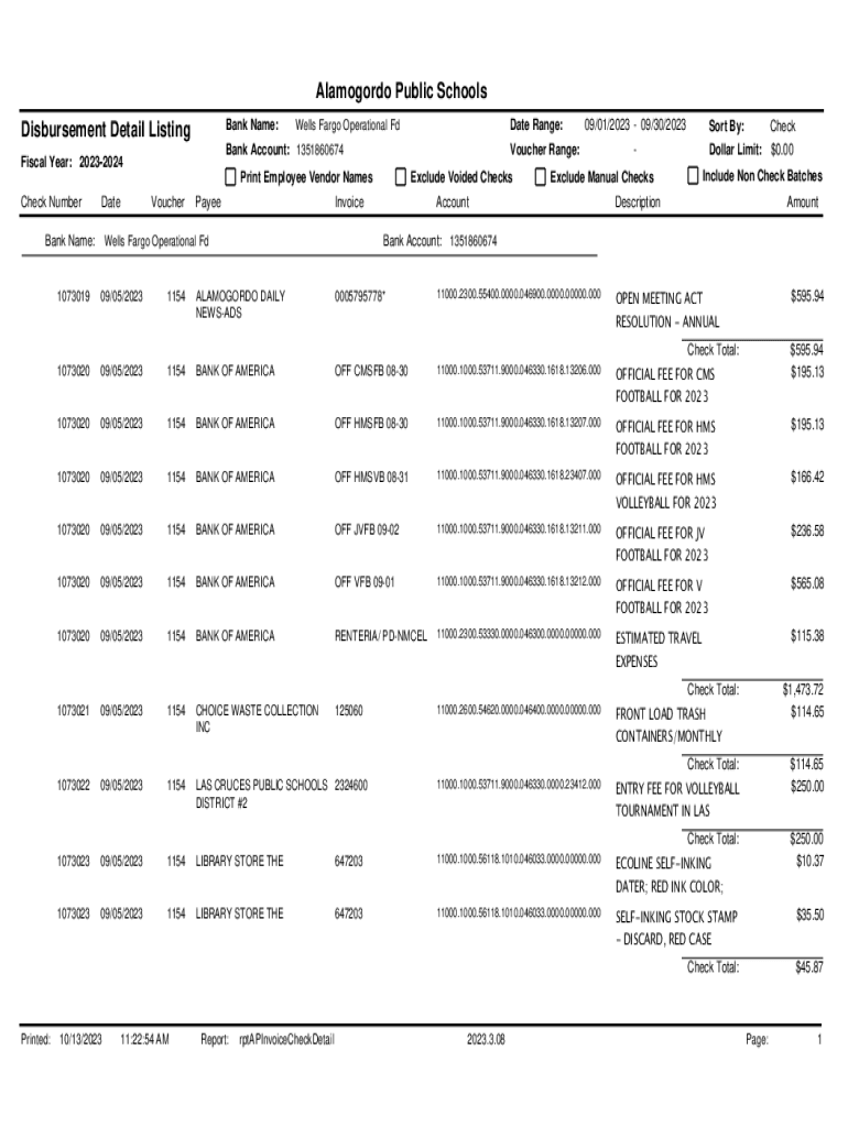 Alamogordo Public Schools Bank Name:Disbursement Detail ListingWells Fargo Operational FdFiscal Year: 20232024 DateVoucherPayeeExclude Voided ChecksInvoiceWells Fargo Operational FdBank Name:09/01/2023