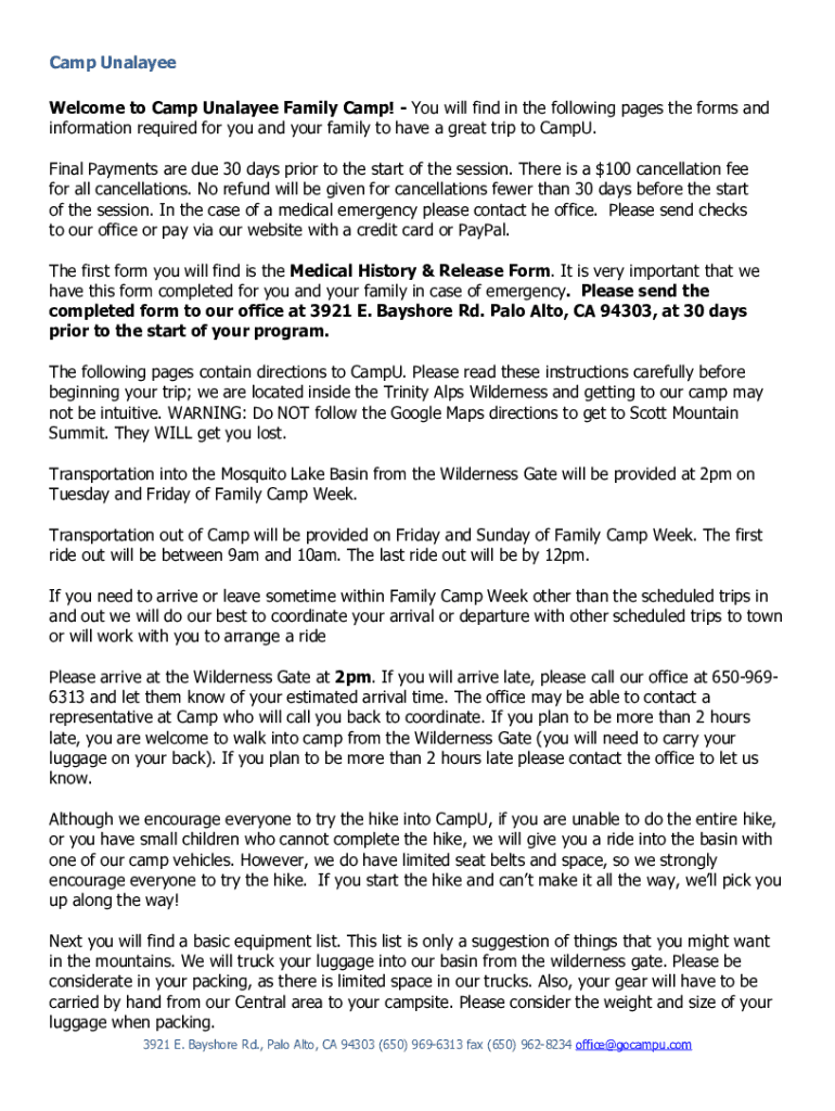 Camp Unalayee Welcome to Camp Unalayee Family Camp! You will find in the following pages the forms and information required for you and your family to have a great trip to CampU. Final Payments are