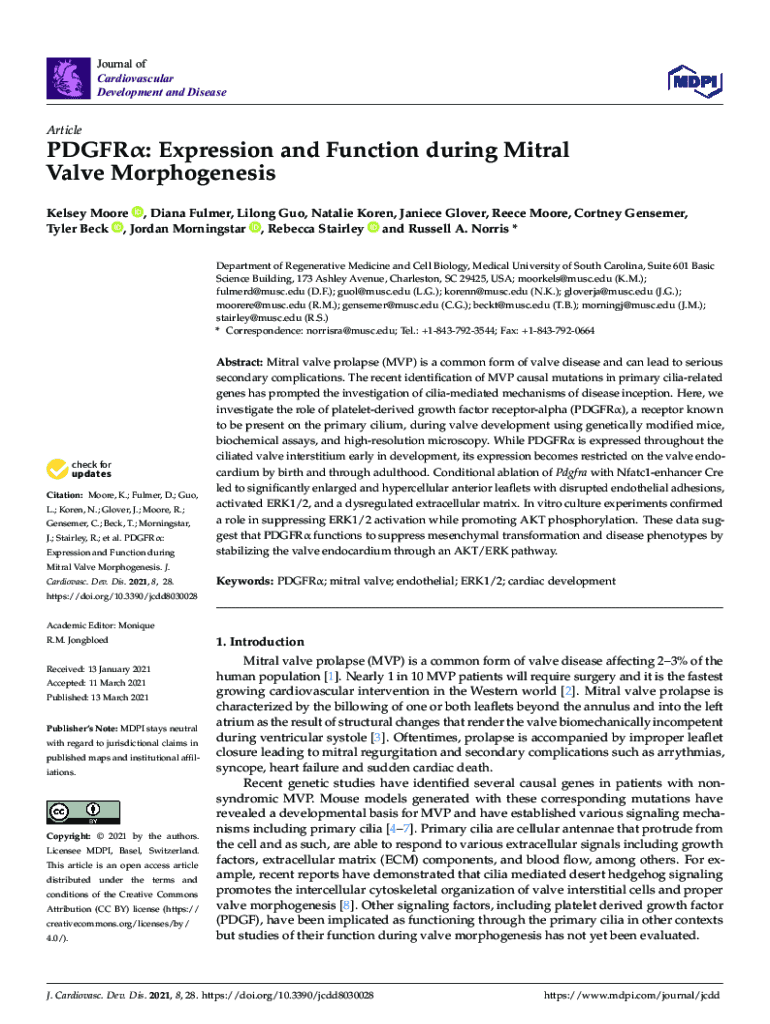 Journal of Cardiovascular Development and DiseaseArticlePDGFR: Expression and Function during Mitral Valve Morphogenesis Kelsey Moore , Diana Fulmer, Lilong Guo, Natalie Koren, Janiece Glover, Reece