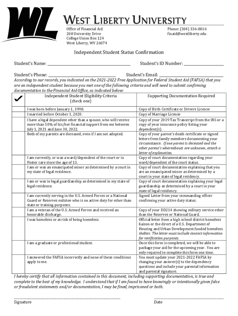 Office of Financial Aid 208 University Drive College Union Box 124 West Liberty, WV 26074Phone: (304) 3368016 finaid@westliberty.eduIndependent Student Status Confirmation Students Name: ___ Students