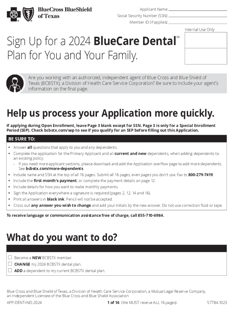 Applicant Name: Social Security Number (SSN): Member ID (if applies): Internal Use OnlySign Up for a 2024 BlueCare Dental Plan for You and Your Family.SMAre you working with an authorized, independent