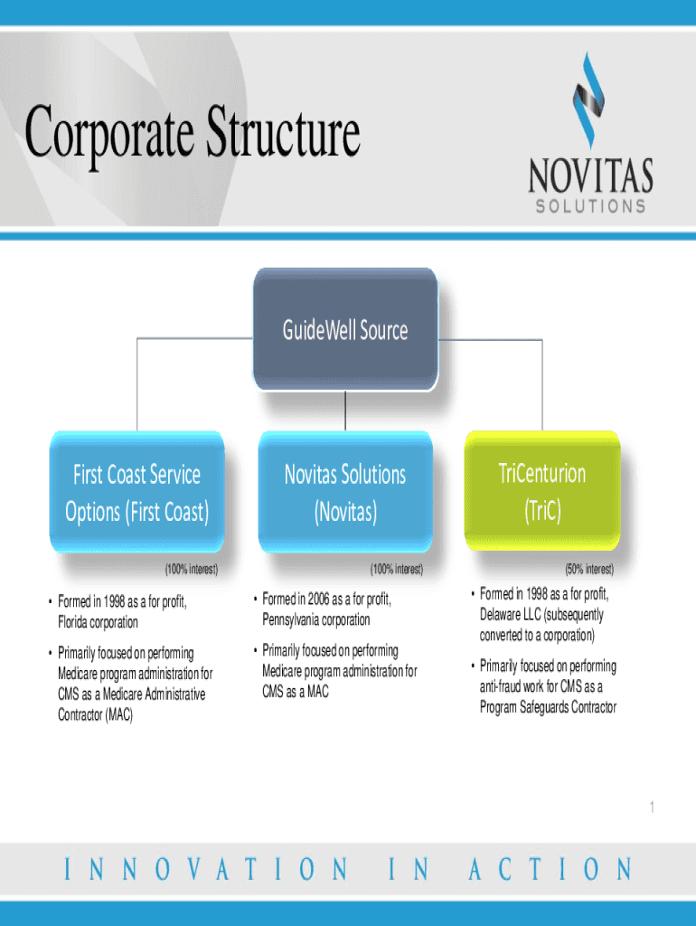 Corporate Structure GuideWell SourceFirst Coast Service Options (First Coast) (100% interest)Novitas Solutions (Novitas) (100% interest) Formed in 1998 as a for profit, Florida corporation Formed