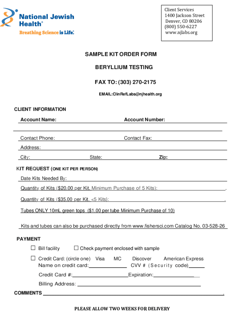 Client Services 1400 Jackson Street Denver, CO 80206 (800) 5506227 www.njlabs.orgSAMPLE KIT ORDER FORM BERYLLIUM TESTING FAX TO: (303) 2702175 EMAIL:ClinRefLabs@njhealth.orgCLIENT INFORMATION Account