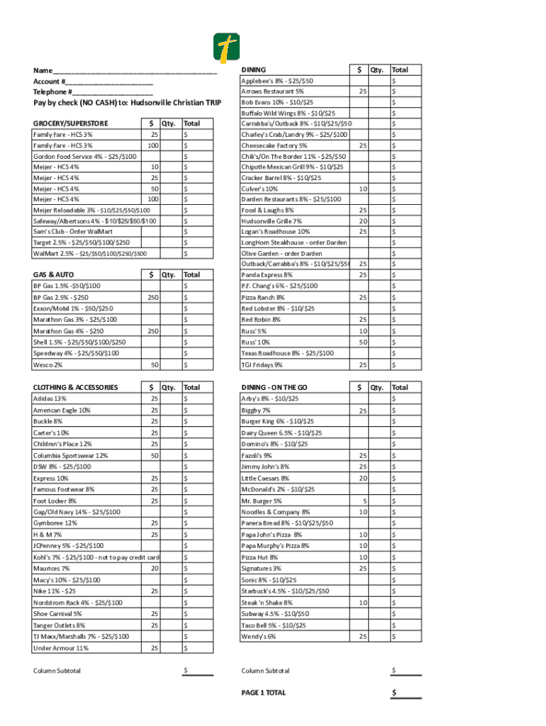 Name___ Account #___ Telephone #___DININGPay by check (NO CASH) to: Hudsonville Christian TRIPBob Evans 10% $10/$25$Buffalo Wild Wings 8% $10/$25$TotalCarrabba\'s/Outback 8% $10/$25/$50$GROCERY/SUPERSTORE$Qty.$Qty.Applebee\'s