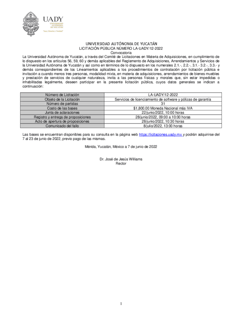 UNIVERSIDAD AUTNOMA DE YUCATN LICITACIN PBLICA NMERO LAUADY/122022 Convocatoria La Universidad Autnoma de Yucatn, a travs del Comit de Licitaciones en Materia de Adquisiciones, en cumplimiento de