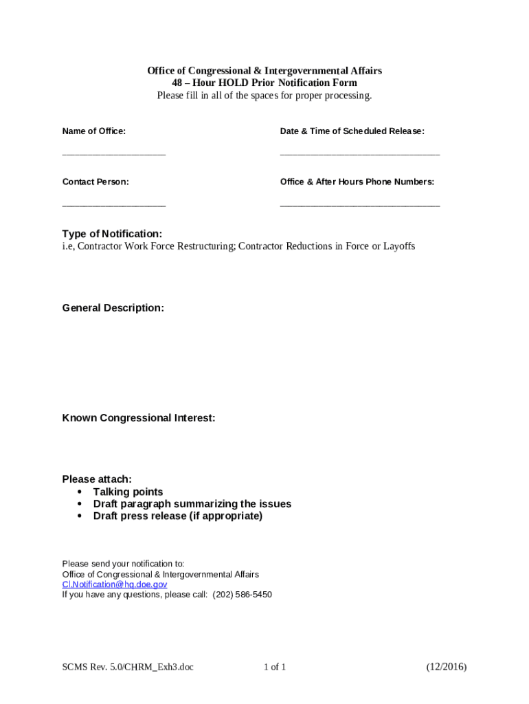 The 48-Hour HOLD Prior Notification is a Word document needed to be submitted to the specific address in order to provide specific info. It has to be completed and signed, which may be done in hard copy, or using a certain software e. g. PDFfiller. It lets you complete any PDF or Word document right in the web, customize it according to your requirements and put a legally-binding electronic signature. Right away after completion, user can send the 48-Hour HOLD Prior Notification to the appropriate recipient, or multiple individuals via email or fax. The blank is printable as well due to PDFfiller feature and options presented for printing out adjustment. Both in digital and physical appearance, your form will have a neat and professional outlook. You may also turn it into a template to use it later, there's no need to create a new file again. All you need to do is to edit the ready document.