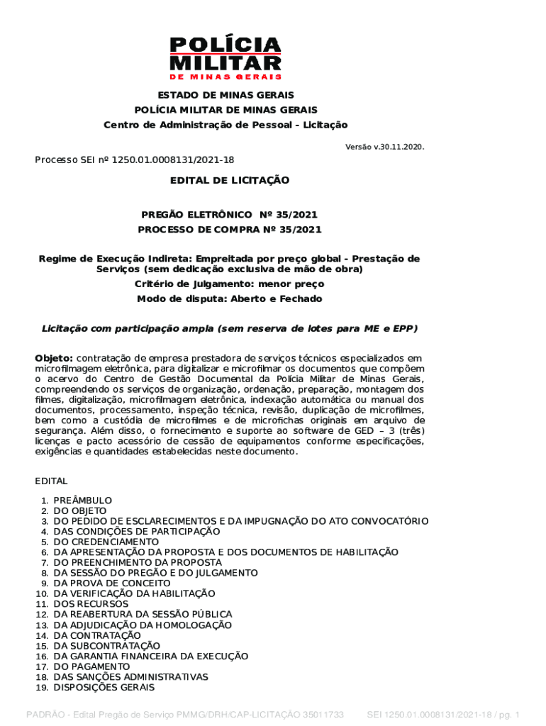 ESTADO DE MINAS GERAIS POLCIA MILITAR DE MINAS GERAIS Centro de Administrao de Pessoal Licitao Verso v.30.11.2020.Processo SEI n 1250.01.0008131/202118EDITAL DE LICITAOPREGO ELETRNICO N 35/2021 PROCESSO