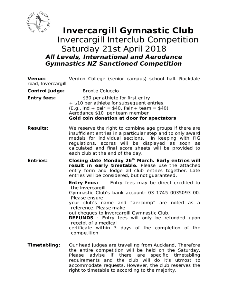 The Invercargill Gymnastic ClubThere's a class to suit every age ... is a Word document that should be submitted to the relevant address in order to provide some info. It must be filled-out and signed, which is possible manually in hard copy, or using a certain solution e. g. PDFfiller. It helps to complete any PDF or Word document directly in your browser, customize it depending on your needs and put a legally-binding e-signature. Right away after completion, you can easily send the Invercargill Gymnastic ClubThere's a class to suit every age ... to the relevant individual, or multiple ones via email or fax. The template is printable as well thanks to PDFfiller feature and options proposed for printing out adjustment. In both electronic and in hard copy, your form will have a neat and professional look. Also you can save it as the template to use it later, so you don't need to create a new file over and over. All that needed is to customize the ready document.