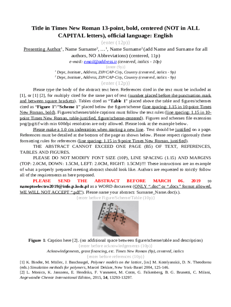 The TITLE OF PAPER (Times New Roman 12 pt bold, CAPITAL ... is a document you can get completed and signed for specified purpose. In that case, it is furnished to the exact addressee to provide certain details of any kinds. The completion and signing can be done manually in hard copy or with an appropriate application like PDFfiller. Such tools help to send in any PDF or Word file without printing them out. While doing that, you can customize its appearance according to your needs and put a legal digital signature. Once you're good, the user ought to send the TITLE OF PAPER (Times New Roman 12 pt bold, CAPITAL ... to the recipient or several recipients by email and even fax. PDFfiller offers a feature and options that make your template printable. It has a number of options when printing out appearance. It doesn't matter how you will send a document - in hard copy or electronically - it will always look well-designed and organized. To not to create a new file from the beginning all the time, turn the original file as a template. Later, you will have an editable sample.