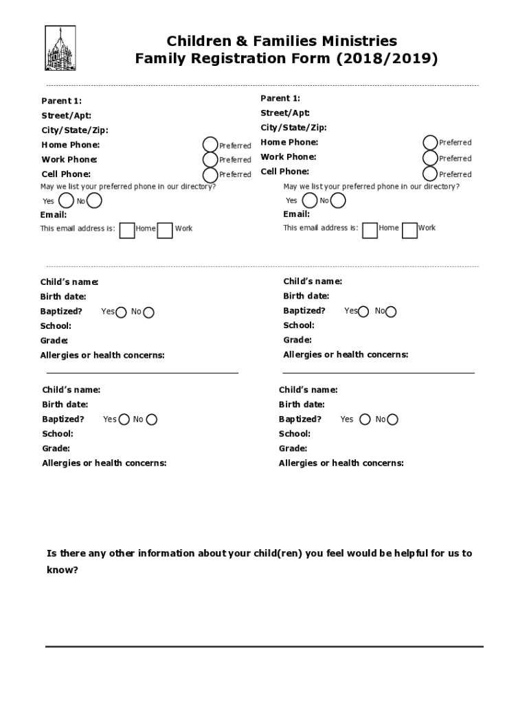 Children & Families Ministries Family Registration Form (2018/2019) Parent 1:Parent 1:Street/Apt:Street/Apt:City/State/Zip:City/State/Zip:Home Phone:PreferredHome Phone:PreferredWork Phone:PreferredWork