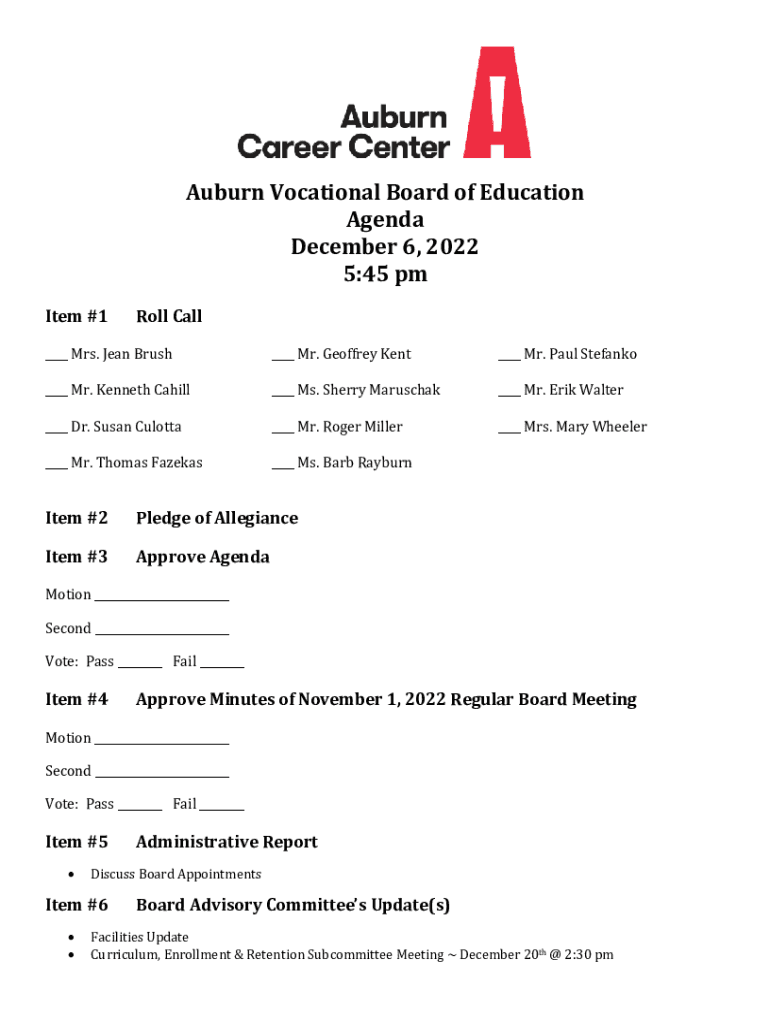 Auburn Vocational Board of Education Agenda December 6, 2022 5:45 pm Item #1Roll Call___ Mrs. Jean Brush___ Mr. Geoffrey Kent___ Mr. Paul Stefanko___ Mr. Kenneth Cahill___ Ms. Sherry Maruschak___