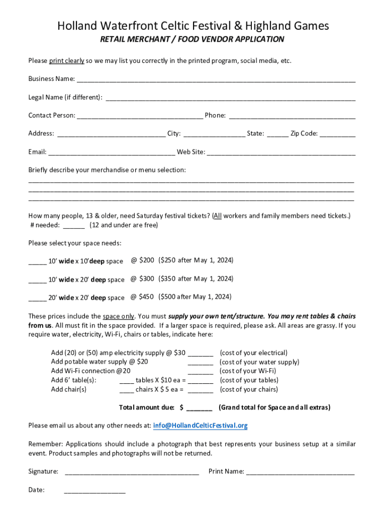 Retail Merchant & Food Vendor Info/Application The Holland Waterfront Celtic Festival & Highland Games in Holland, Michigan is seeking Retail Merchants and Food Vendors with quality Celtic goods to
