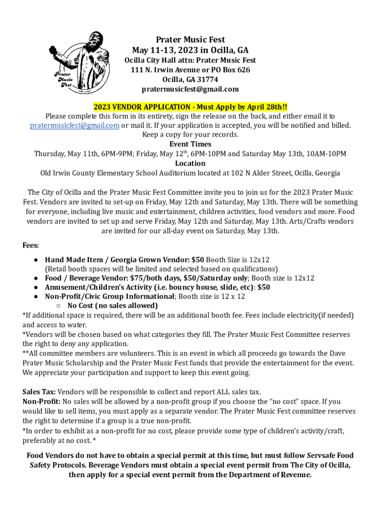 Rater Music Festal 1113, 2023 in Villa, Gorilla City Hall attn: Prater Music Fest111 N. Irwin Avenue or PO Box 626Ocilla, GA 31774pratermusicfest@gmail.com023 VENDOR APPLICATION Must Apply by April 28th!!2