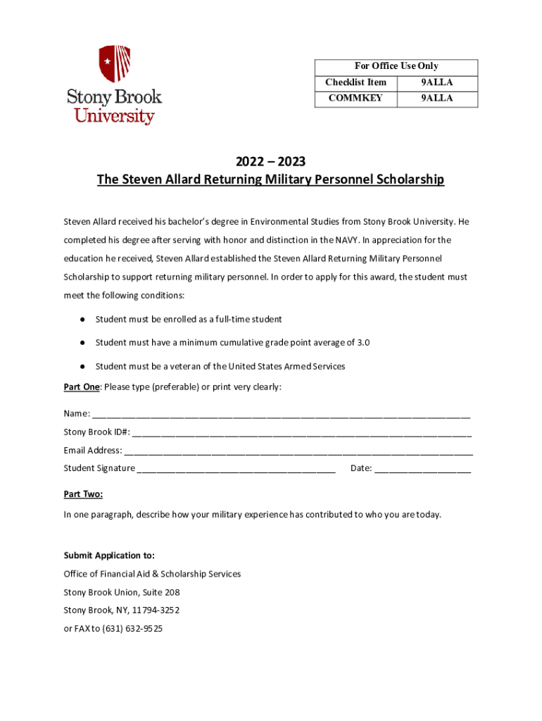 For Office Use Only Checklist Item9ALLACOMMKEY9ALLA2022 2023 The Steven Allard Returning Military Personnel Scholarship Steven Allard received his bachelors degree in Environmental Studies from Stony