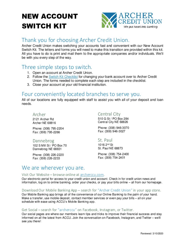 NEW ACCOUNT SWITCH KIT Thank you for choosing Archer Credit Union. Archer Credit Union makes switching your accounts fast and convenient with our New Account Switch Kit. The letters and forms you