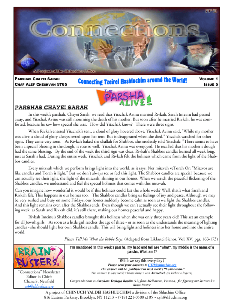PARSHAS CHAYEI SARAH CHAF ALEF CHESHVAN 5765VOLUME 1 ISSUE 5PARSHAS CHAYEI SARAH In this week\'s parshah, Chayei Sarah, we read that Yitzchak Avinu married Rivkah. Sarah Imeinu had passed away, and