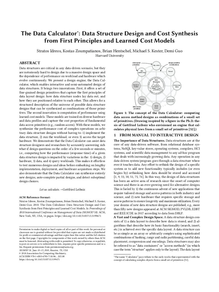 The Data Calculator: Data Structure Design and Cost Synthesis from First Principles and Learned Cost Models Stratos Idreos, Kostas Zoumpatianos, Brian Hentschel, Michael S. Kester, Demi Guo Harvard