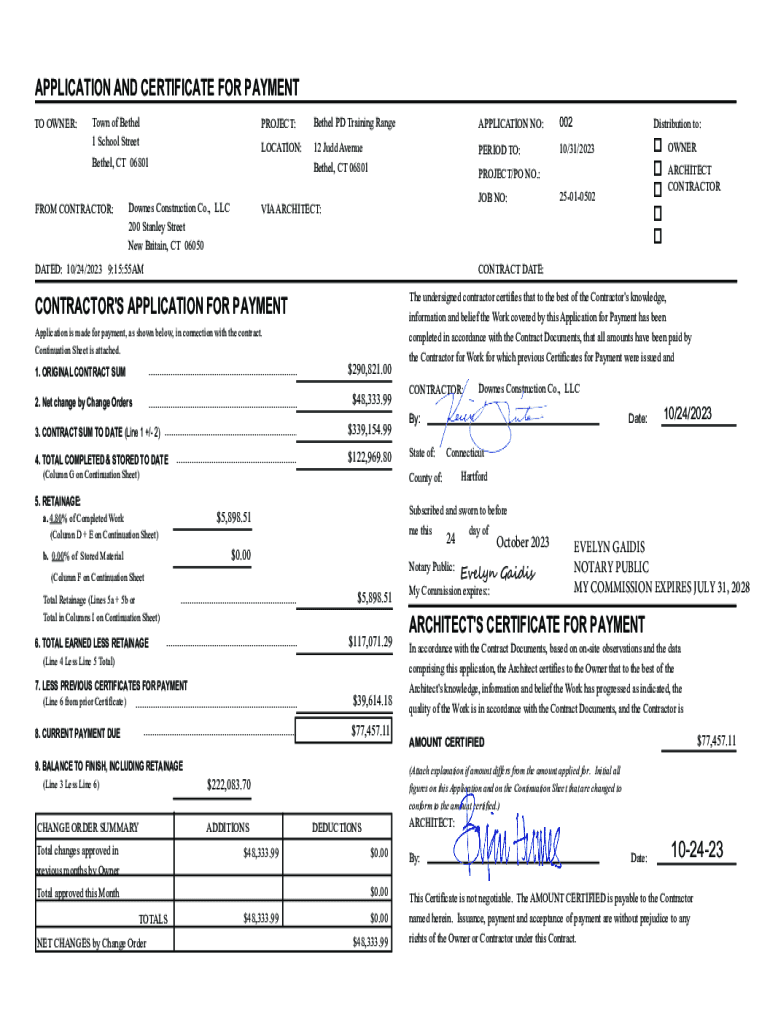 APPLICATION AND CERTIFICATE FOR PAYMENT TO OWNER:Town of Bethel 1 School Street Bethel, CT 06801FROM CONTRACTOR:Downes Construction Co., LLC 200 Stanley Street New Britain, CT 06050PROJECT:Bethel