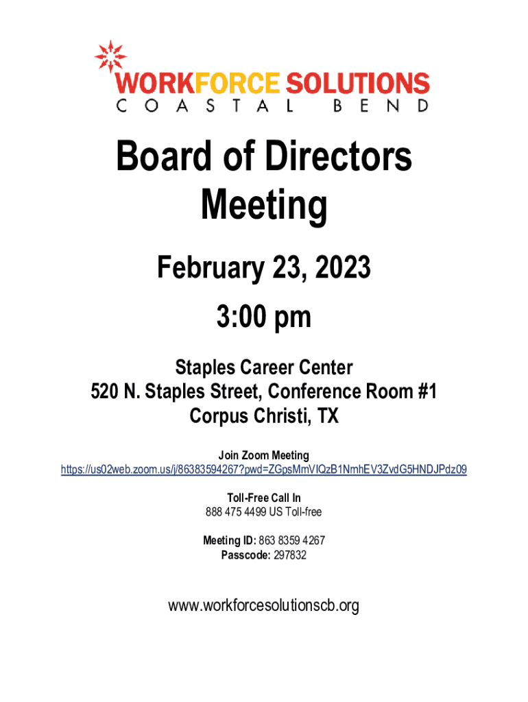 Board of Directors Meeting February 23, 2023 3:00 pm Staples Career Center 520 N. Staples Street, Conference Room #1 Corpus Christi, TX Join Zoom Meeting https://us02web.zoom.us/j/86383594267?pwdZGpsMmVIQzB1NmhEV3ZvdG5HNDJPdz09
