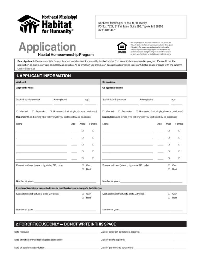 Northeast Mississippi Habitat for Humanity PO Box 7321, 213 W. Main, Suite 260, Tupelo, MS 38802 (662) 8424675ApplicationWe are pledged to the letter and spirit of U.S. policy for the achievement