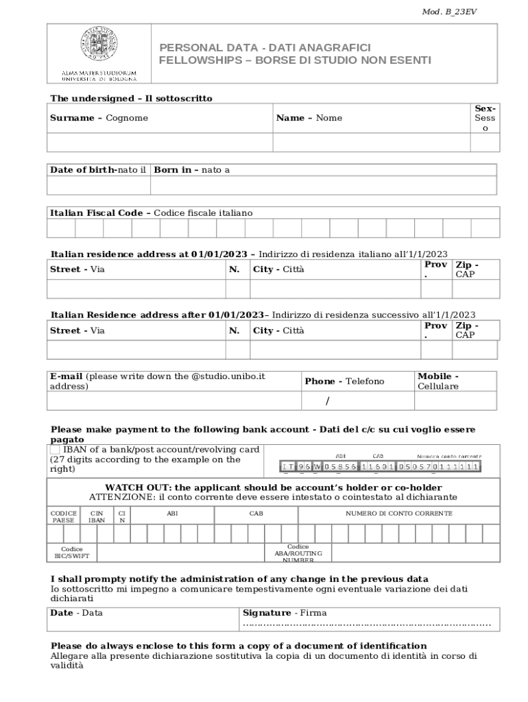 The dati fiscali non residenti borse di studio non esenti is a writable document required to be submitted to the specific address in order to provide certain info. It has to be filled-out and signed, which is possible manually, or with the help of a certain solution e. g. PDFfiller. It helps to fill out any PDF or Word document right in the web, customize it depending on your needs and put a legally-binding electronic signature. Right away after completion, you can easily send the dati fiscali non residenti borse di studio non esenti to the appropriate individual, or multiple recipients via email or fax. The template is printable as well from PDFfiller feature and options proposed for printing out adjustment. In both digital and in hard copy, your form will have got clean and professional look. It's also possible to turn it into a template for further use, so you don't need to create a new blank form from the beginning. All that needed is to amend the ready form.