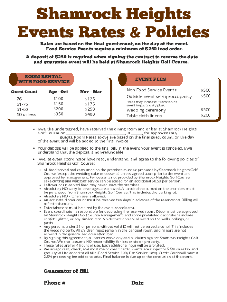 Shamrock Heights Events Rates & Policies Rates are based on the final guest count, on the day of the event. Food Service Events require a minimum of $250 food order. A deposit of $250 is required