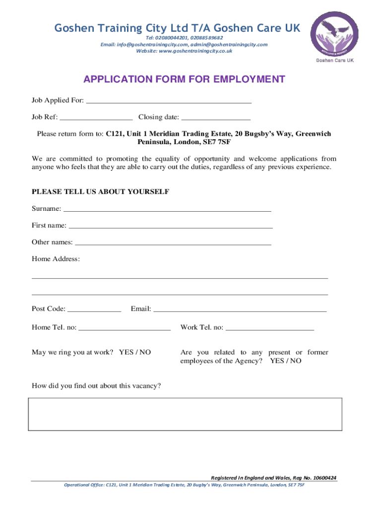 Goshen Training City Ltd T/A Goshen Care UK Tel: 02080044201, 02088589682 Email: info@goshentrainingcity.com, admin@goshentrainingcity.com Website: www.goshentrainingcity.co.uk Goshen Care APPLICATION