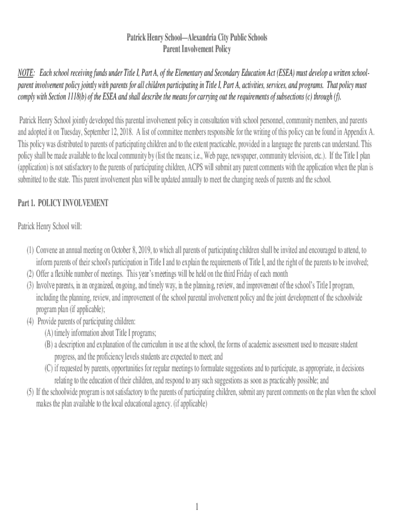Patrick Henry SchoolAlexandria City Public Schools Parent Involvement Policy NOTE: Each school receiving funds under Title I, Part A, of the Elementary and Secondary Education Act (ESEA) must develop