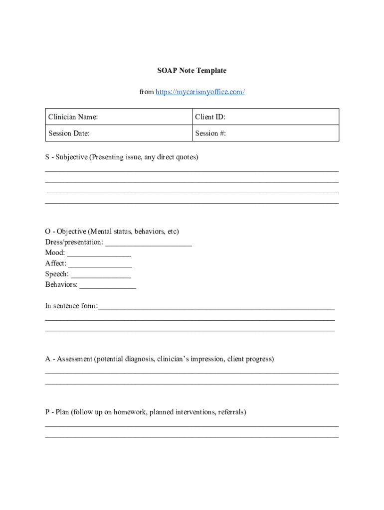 SOAP Note Template from https://mycarismyoffice.com/ Clinician Name:Client ID:Session Date:Session #:S Subjective (Presenting issue, any direct quotes) ___ ___ ___ ___O Objective (Mental status, behaviors,