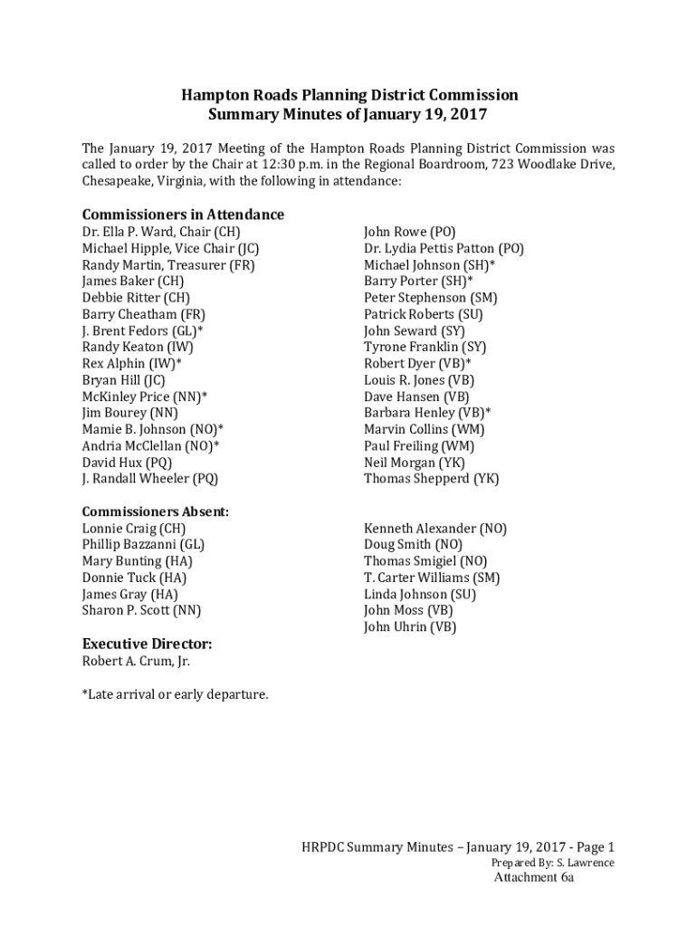 Hampton Roads Planning District Commission Summary Minutes of January 19, 2017 The January 19, 2017 Meeting of the Hampton Roads Planning District Commission was called to order by the Chair at 12:30