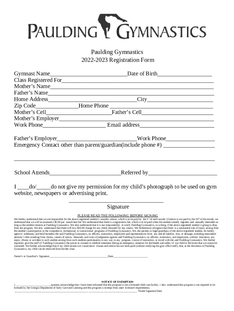 The Entry-Registration - Jewart's Gymnastics is a document needed to be submitted to the specific address to provide specific information. It needs to be completed and signed, which is possible manually, or via a certain software like PDFfiller. It lets you complete any PDF or Word document directly from your browser (no software requred), customize it depending on your needs and put a legally-binding e-signature. Once after completion, you can send the Entry-Registration - Jewart's Gymnastics to the relevant person, or multiple ones via email or fax. The template is printable as well from PDFfiller feature and options presented for printing out adjustment. Both in digital and physical appearance, your form should have a organized and professional outlook. Also you can turn it into a template for later, there's no need to create a new blank form from the beginning. You need just to edit the ready sample.