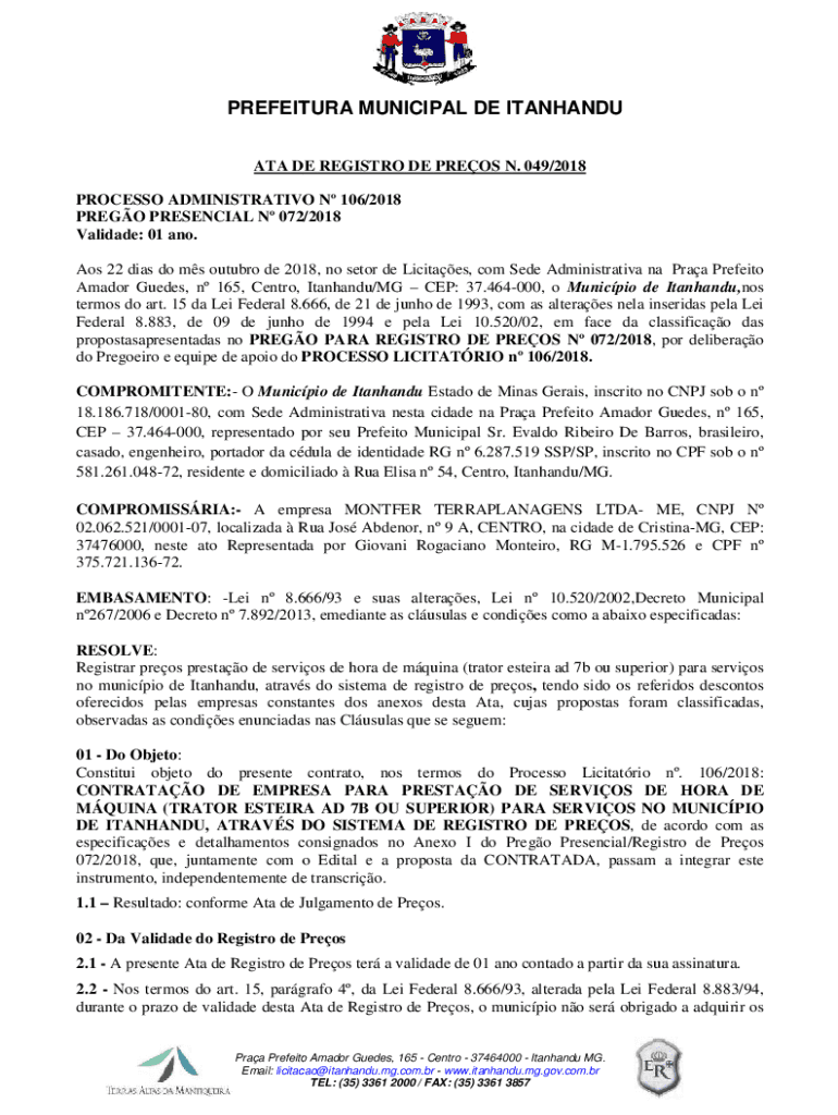 PREFEITURA MUNICIPAL DE ITANHANDU ATA DE REGISTRO DE PREOS N. 049/2018 PROCESSO ADMINISTRATIVO N 106/2018 PREGO PRESENCIAL N 072/2018 Validade: 01 ano. Aos 22 dias do ms outubro de 2018, 201 , no