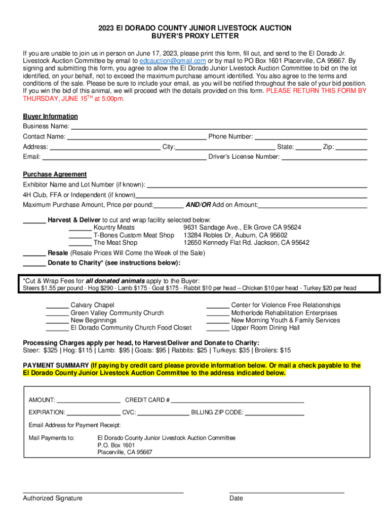 2023 El DORADO COUNTY JUNIOR LIVESTOCK AUCTION BUYERS PROXY LETTER If you are unable to join us in person on June 17, 2023, please print this form, fill out, and send to the El Dorado Jr. Livestock