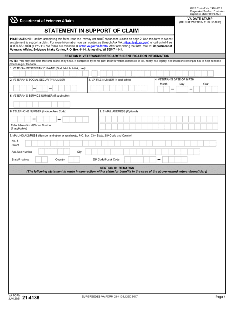 OMB Control No. 29000075 Respondent Burden: 15 minutes Expiration Date: 06/30/2024VA DATE STAMP(DO NOT WRITE IN THIS SPACE)STATEMENT IN SUPPORT OF CLAIM INSTRUCTIONS: Before completing this form,