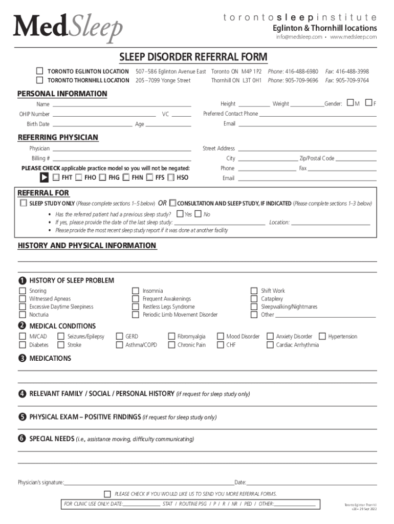 info@medsleep.com www.medsleep.comSLEEP DISORDER REFERRAL FORMTORONTO CLINTON LOCATION507 586 Clinton Avenue East Toronto ON M4P 1P2Phone: 4164886980Fax: 4164883998