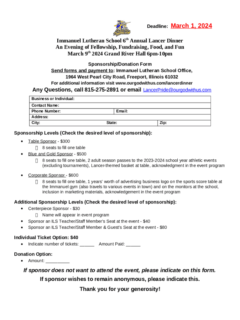 Instructions for the form Immanuel Lutheran School 6th Annual Lancer Dinner
