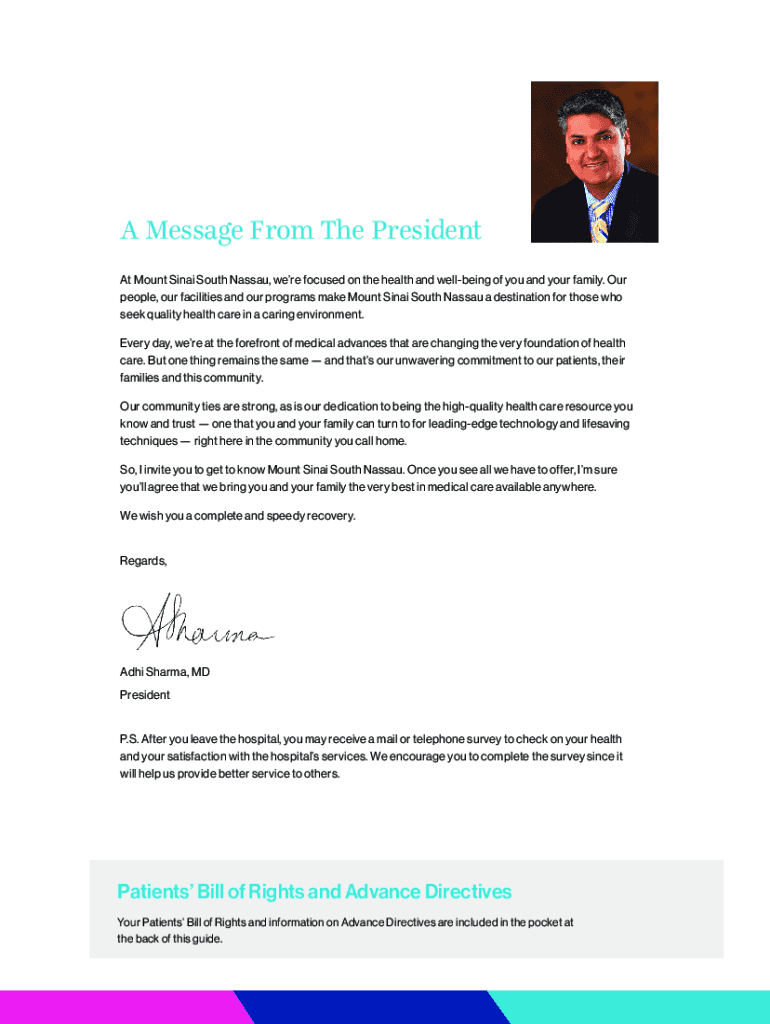 A Message From The President At Mount Sinai South Nassau, were focused on the health and wellbeing of you and your family. Our people, our facilities and our programs make Mount Sinai South Nassau