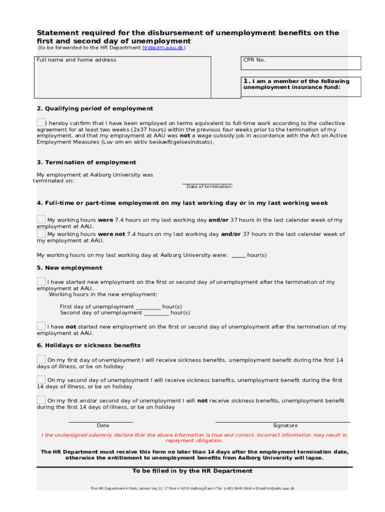 Instructions for the Statement required for the disbursement of unemployment benefits on the first and second day of unemployment form