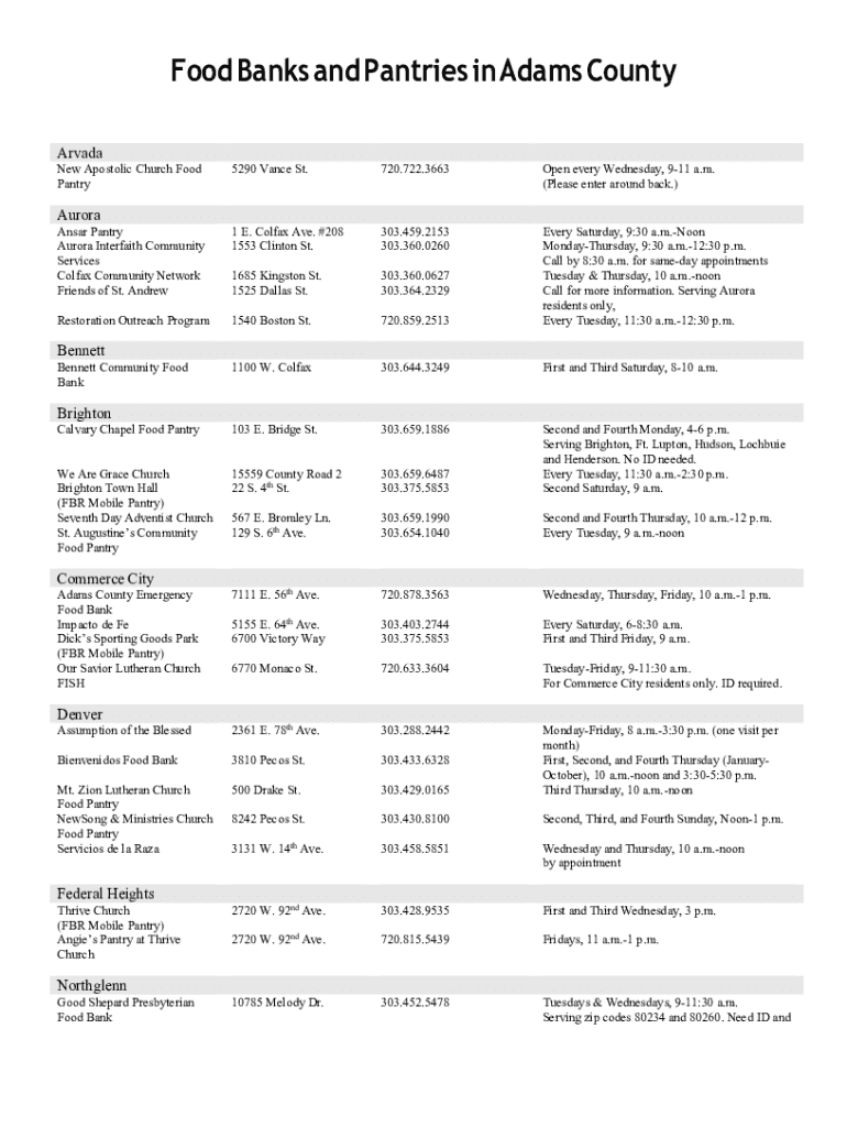 Food Banks and Pantries in Adams County ArvadaNew Apostolic Church Food Pantry5290 Vance St.720.722.3663Open every Wednesday, 911 a.m. (Please enter around back.)Ansar Pantry Aurora Interfaith Community