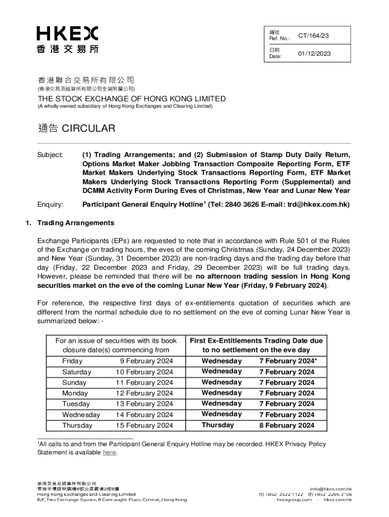 Ref. No.:CT/164/23 Date:01/12/2023 ()THE STOCK EXCHANGE OF HONG KONG LIMITED (A wholly owned subsidiary of Hong Kong Exchanges and Clearing Limited) CIRCULAR Subject:(1) Trading Arrangements; and