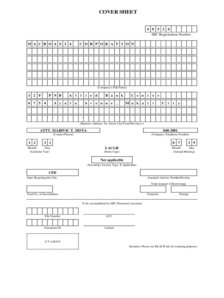 M A C R O A S I AC O R P O R A T I O N(Companies Full Name)1 2 FP N B6 7 5 4A LA y an la lie dB an n a v e n u e, C e n t e r