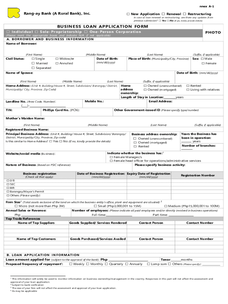 Annex A1Rangay Bank (A Rural Bank), Inc. New Application Renewal Restructuring In case of loan renewal or restructuring, are there any updates from previous submission? Yes No (If yes, kindly provide