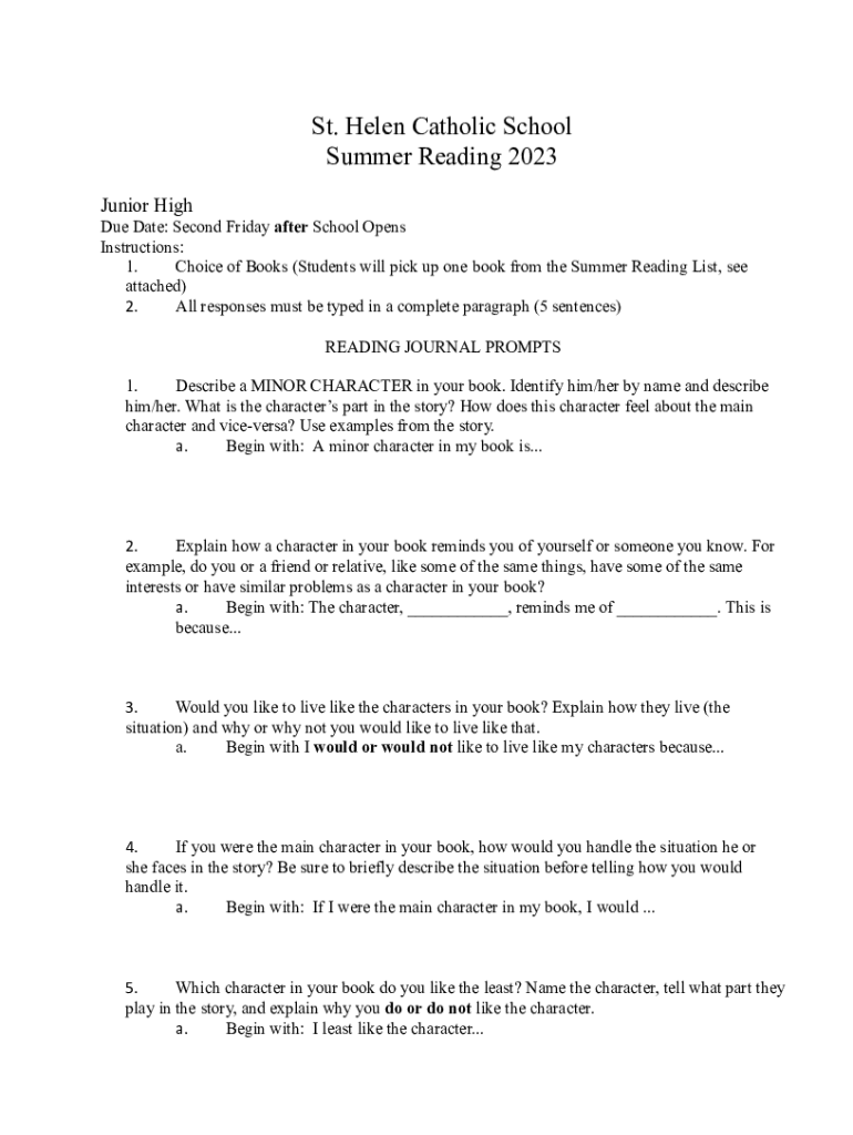 St. Helen Catholic School Summer Reading 2023 Junior High Due Date: Second Friday after School Opens Instructions: 1. Choice of Books (Students will pick up one book from the Summer Reading List,